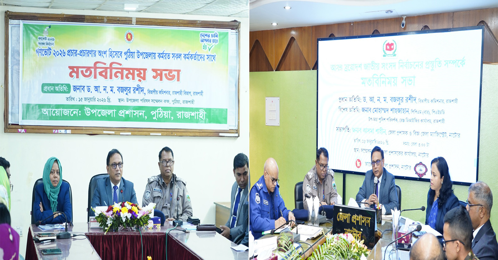 স্টাফ রিপোর্টার : নাটোর জেলা প্রশাসন কর্তৃক আয়োজিত “ত্রয়োদশ জাতীয় সংসদ নির্বাচনের প্রস্তুতি সম্পর্কে মতবিনিময় সভা” এবং পুঠিয়া উপজেলা প্রশাসন, রাজশাহী কর্তৃক আয়োজিত “গণভোট ২০২৬ প্রচার-প্রচারণার অংশ হিসেবে পুঠিয়া উপজেলায় কর্মরত সকল কর্মকর্তার সাথে মতবিনিময় সভা’’ অনুষ্ঠিত হয়েছে। বৃহস্পতিবার (১৫ জানুয়ারি) অনুষ্ঠিত দুইটি সভায় প্রধান অতিথি হিসেবে উপস্থিত ছিলেন মান্যবর রাজশাহী বিভাগীয় কমিশনার ড. আ. ন. ম. বজলুর রশীদ। সভায় ত্রয়োদশ জাতীয় সংসদ নির্বাচন ও গণভোট-২০২৬ সুষ্ঠুভাবে অনুষ্ঠানে বিভিন্ন দিক-নির্দেশনা প্রদান করেন তিনি।