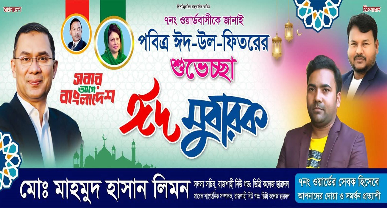 স্টাফ রিপোর্টার : রাজশাহী নগরীর ৭ নং ওয়ার্ডবাসীকে ঈদ শুভেচ্ছা জানিয়েছেন তরুন ছাত্রনেতা মাহমুদ হাসান লিমন। তার ফেসবুকে দেওয়া শুভেচ্ছা বার্তায় তিনি জানান, আমার প্রাণপ্রিয় ৭ নং ওয়ার্ডবাসী এবং রাজশাহী নগরীর সর্বস্তরের জনসাধারণ, আপনাদের জানাই পবিত্র ঈদুল ফিতরের আন্তরিক শুভেচ্ছা ‘ঈদ মোবারক’।