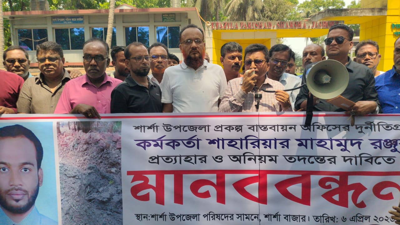 বেনাপোল প্রতিনিধি : যশোরের শার্শা উপজেলায় প্রকল্প বাস্তবায়ন কর্মকর্তা (পিআইও) শাহারিয়ার মাহমুদ রঞ্জুর প্রত্যাহার ও তার বিরুদ্ধে দুর্নীতির অভিযোগ তদন্তের দাবিতে মানববন্ধন ও স্মারকলিপি বিক্ষোভ মিছিল কর্মসূচি পালন করেছেন শার্শাবাসী।